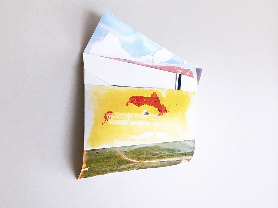 4 dried photos after soaking in water, 2 back of photos, 1 printed mobile image on photo paper, cut, fold, bent and layered.